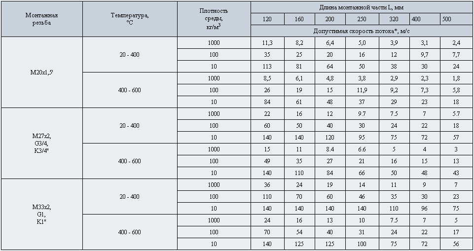 * - для гильз ЮНКЖ Х16.33, ЮНКЖ Х16.G1, ЮНКЖ 016.К1" допустимая скорость потока рассчитана с учетом возможного уменьшения толщины стенки на 1 мм.