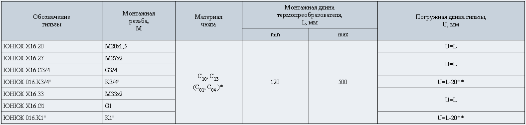 Перечень основных исполнений гильз защитных конструктивной модификации ЮНКЖ Х16
