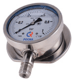 Промышленный манометр полностью из нержавеющей стали для агрессивных жидких и газообразных, не вязких и не кристаллизующихся измеряемых сред с температурой до 150 °С, так же используются в условиях агрессивной окружающей среды.